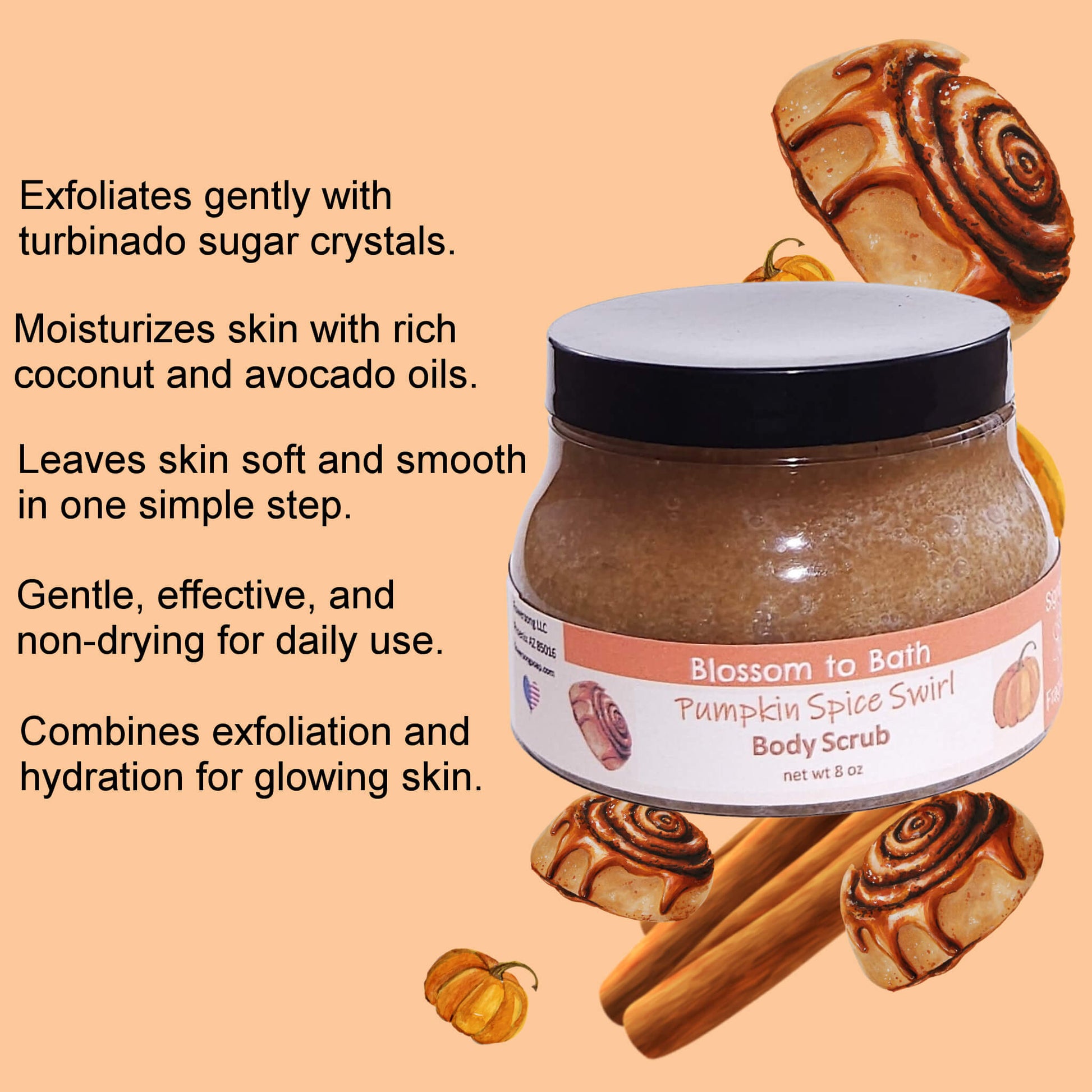 Pumpkin Spice Swirl Body Scrub is an exfoliating scrub that leaves the skin soft, hydrated and refreshed. Turbinado Sugar renews skin while plant-based oils seal in moisture. Exfoliating 2-3 times per week keeps the skin free of dead skin cells for a baby soft feel.